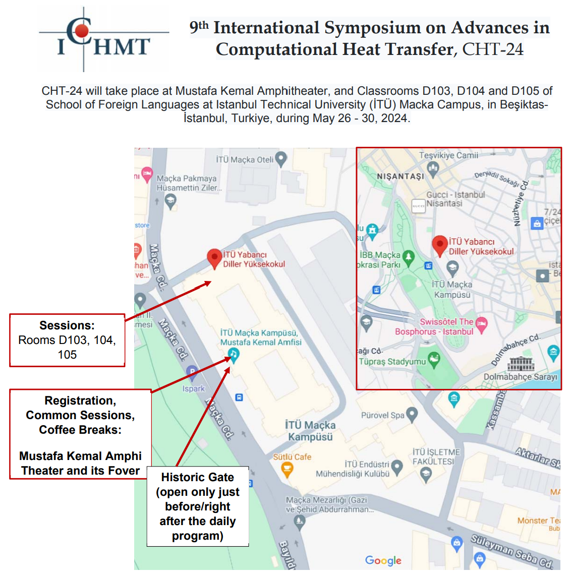 The International Centre for Heat and Mass Transfer is pleased to announce the 9th International Symposium on Advances in Computational Heat Transfer, CHT-24, to take place at Mustafa Kemal Amphitheater, and Classrooms D103, D104 and D105 of School of Foreign Languages at Istanbul Technical University(ITU) Macka Campus, in Besiktas-Istanbul, Turkiye, during May 26 - 30, 2024.